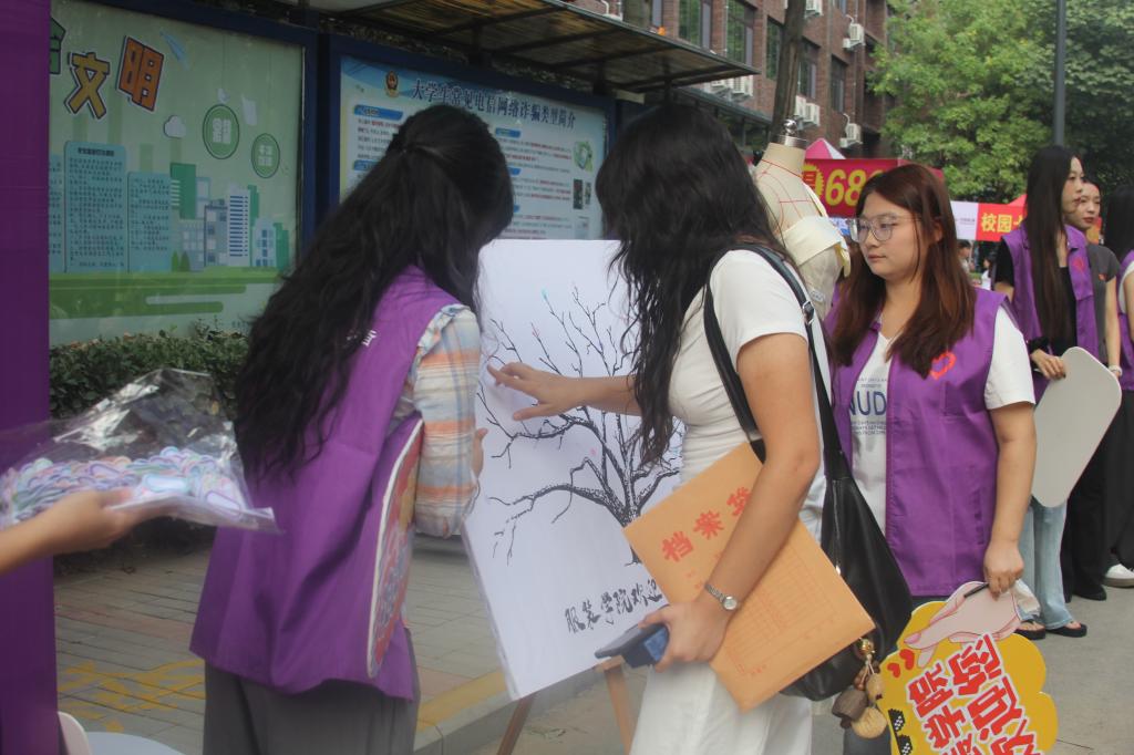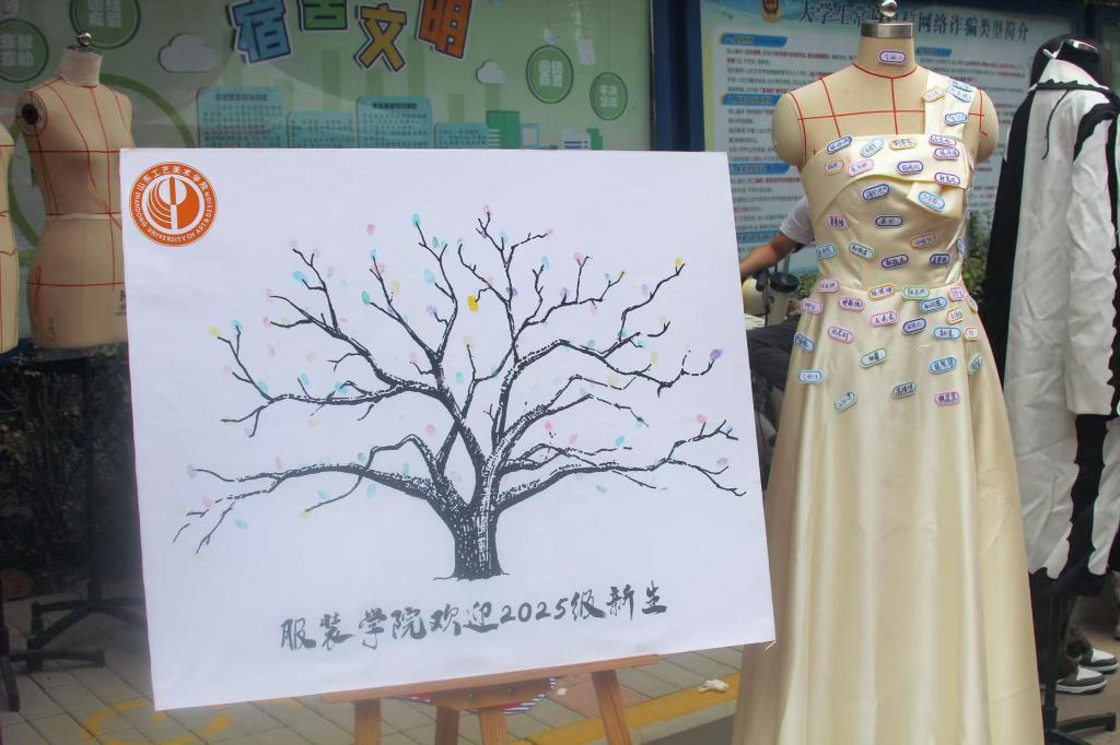 在学院报到点,各班级代班班主任和学生助理准备就绪。同时,学院精心设计两项创意迎新活动,让新生沉浸式感受专业魅力:在“衣梦起航,共赴时尚新程”环节,新生将写有自己名字的特制名牌,粘贴在提前备好的精美礼服上,共同“缝制”出专属2025级的独特作品;“扎根服装沃土,不负精彩年华”活动中,巨幅画卷铺开,新生蘸取彩墨,用指尖按下色彩印记,汇聚成象征成长与团结的“指纹树”,留下专属入学纪念。